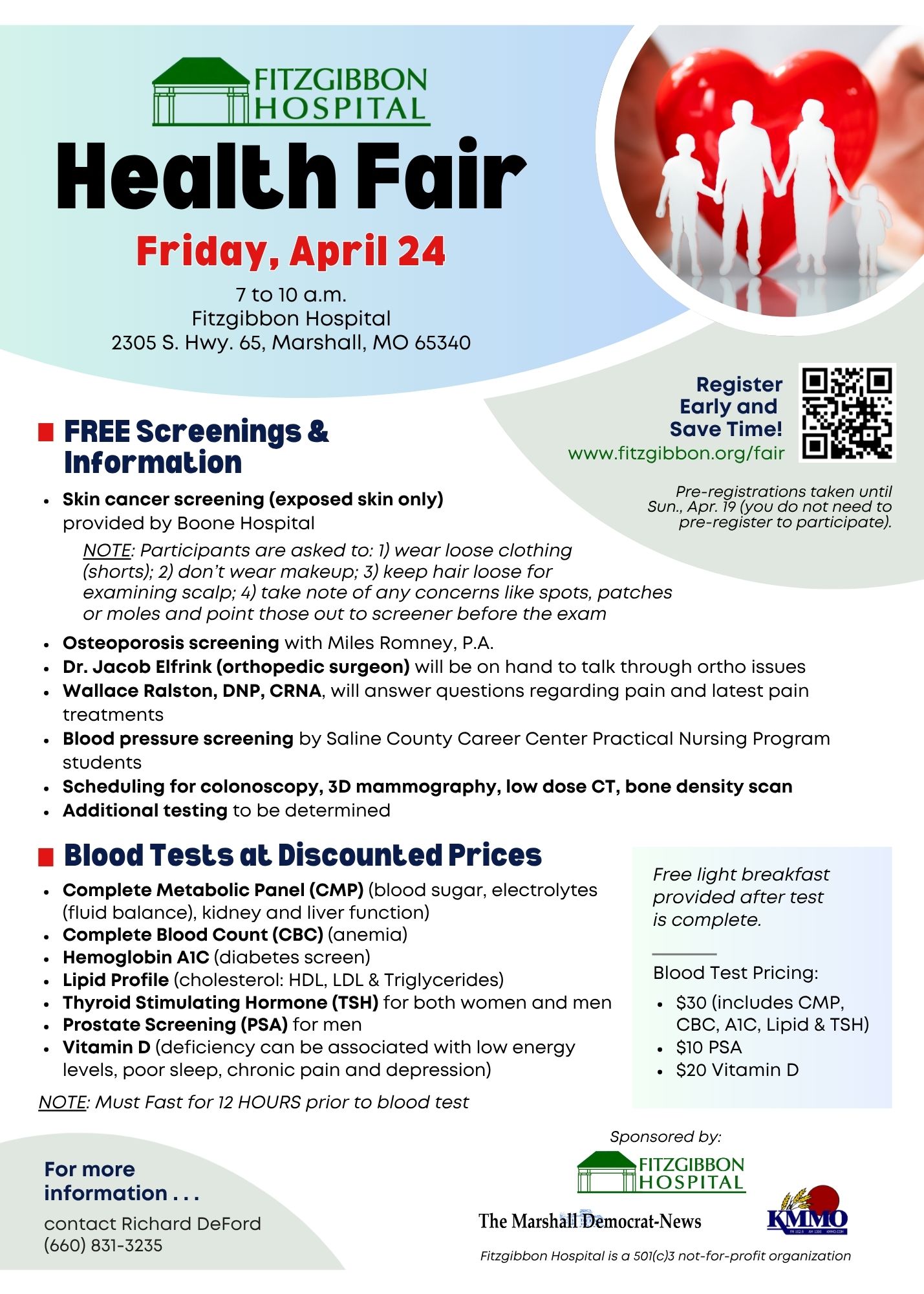 For more information, call (660) 831-3235. The Health Fair is sponsored by Fitzgibbon Hospital in collaboration with The Marshall Democrat-News and KMMO Radio.